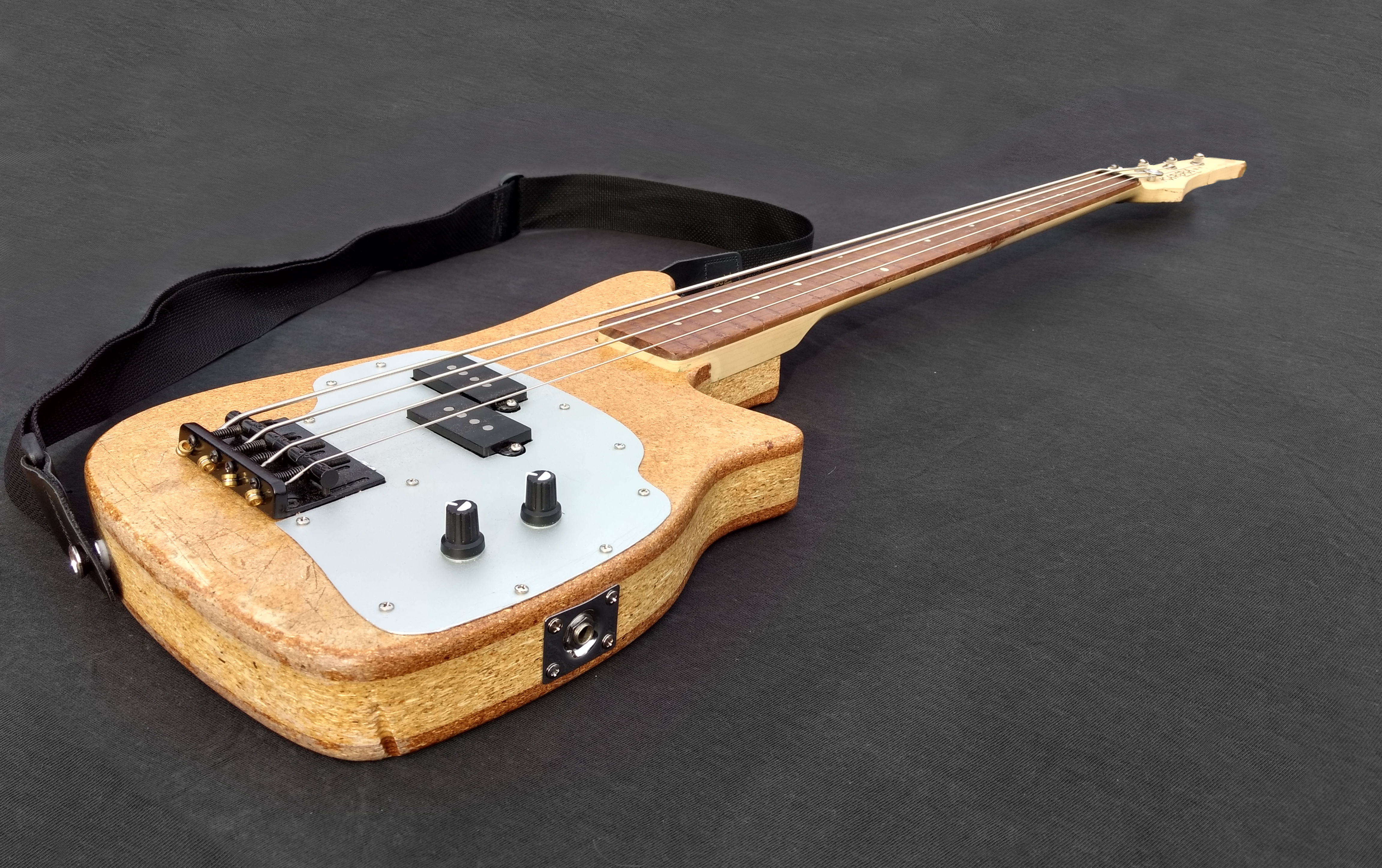 An electric bass made from repurposed parts. The neck was found already de-fretted in the trash. The body was milled from a composite-wood work desk, showing all the existing scratches and stains from its years of use. The scratch plate is cut from the aluminum body of a Macbook Pro.